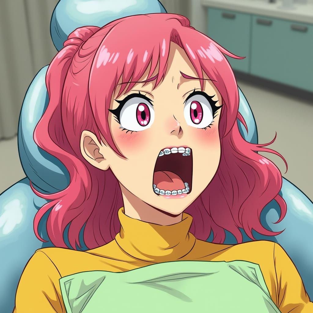 A digital artwork of a woman with pink hair in a dentist chair. Her mouth is open, revealing braces. The image is drawn with bold lines and exaggerated expressions in a manga style.