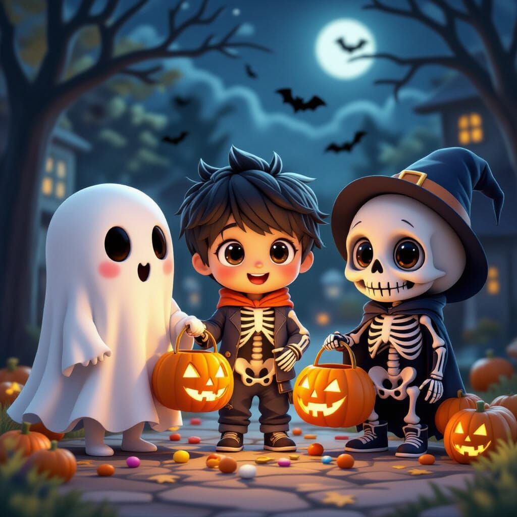 A charming 3D realistic anime scene depicts skeleton children collecting candy on Halloween, with a friendly ghost nearby, rendered in high dynamic range.