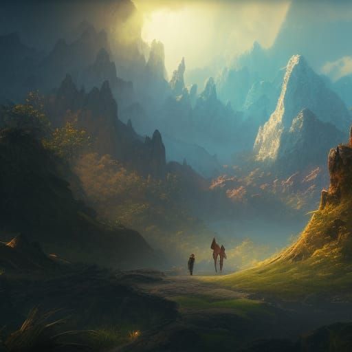 This image showcases a breathtaking otherworldly mountain landscape. The detailed matte painting features deep, rich colors and intricate details, creating a fantastical scene in high resolution.