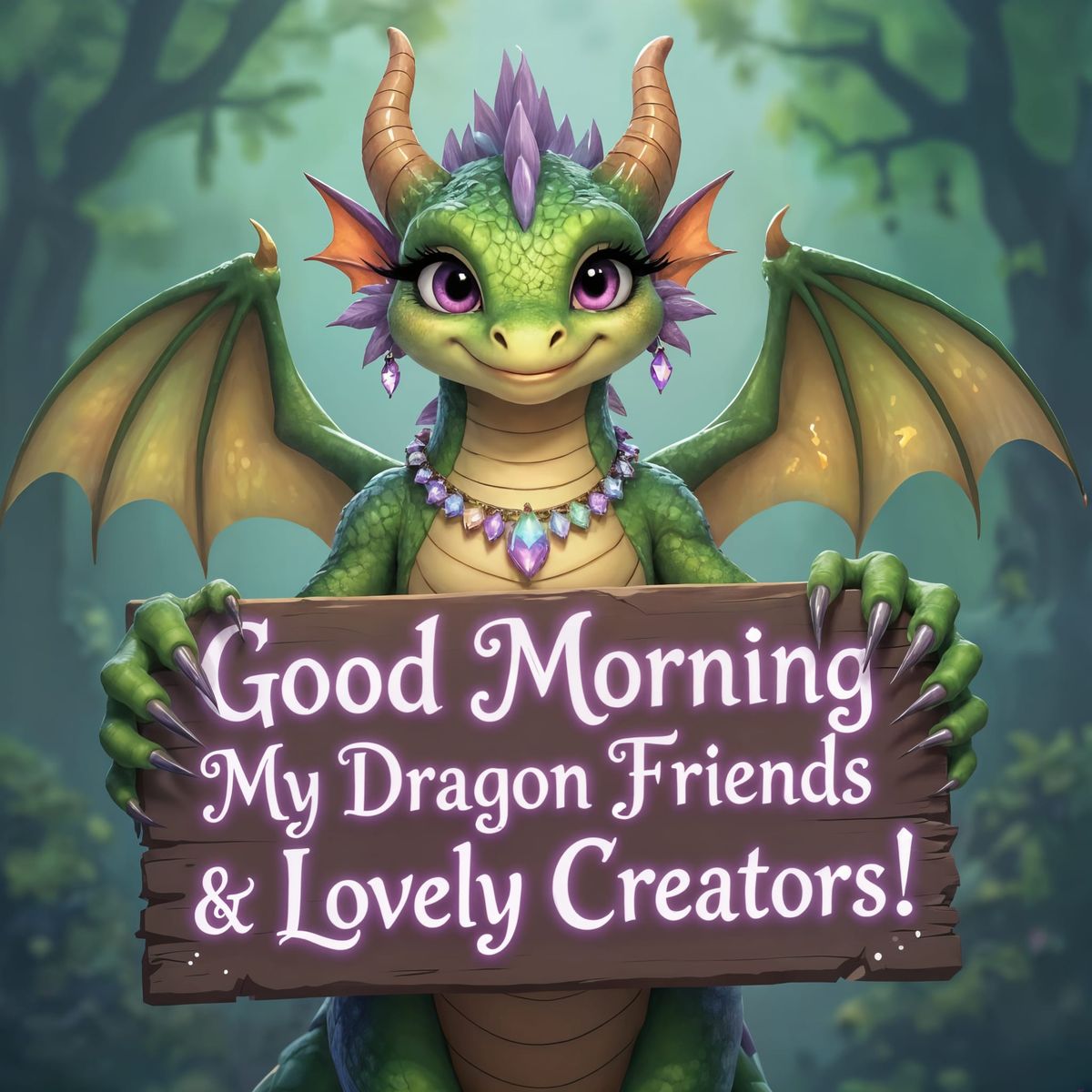 A vibrant image of a friendly green dragon holding a sign. The dragon has glittering scales, wings, purple eyes, and long eyelashes, rendered with a glowing, fantastical aesthetic.