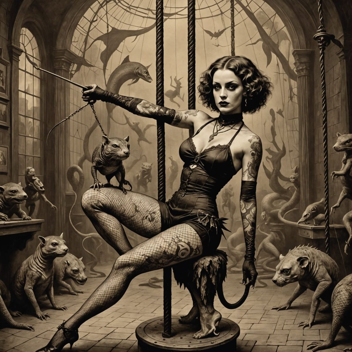 This vintage sepia photograph captures a tattooed contortionist performing pole dancing with a disturbing animal, rendered in the dramatic, dark style of Gustave Doré.