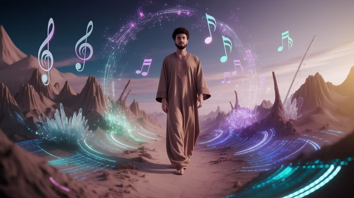 Hyperrealistic photo of a wide-eyed Moroccan character, male, aged 20-30, with traditional Moroccan clothing (e.g., a modern djellaba or gandoura in earthy tones, or a subtle pattern), sneaking stealthily through a fantastical, magical kingdom of AI Music inspiration. The character's eyes are wide with wonder and slight apprehension. The kingdom is an abstract landscape composed of glowing, ethereal musical notes, digital sound waves, circuit board patterns, and shimmering light particles. The environment should feel both organic and technological, with elements like glowing, crystalline oud strings or floating, translucent qraqeb. The color palette is rich and deep, featuring glowing blues, purples, and electric greens, contrasted with warm, subtle golden light emanating from the "music" elements. Cinematic lighting, shallow depth of field, highly detailed, sharp focus on the character, volumetric light, --ar 16:9