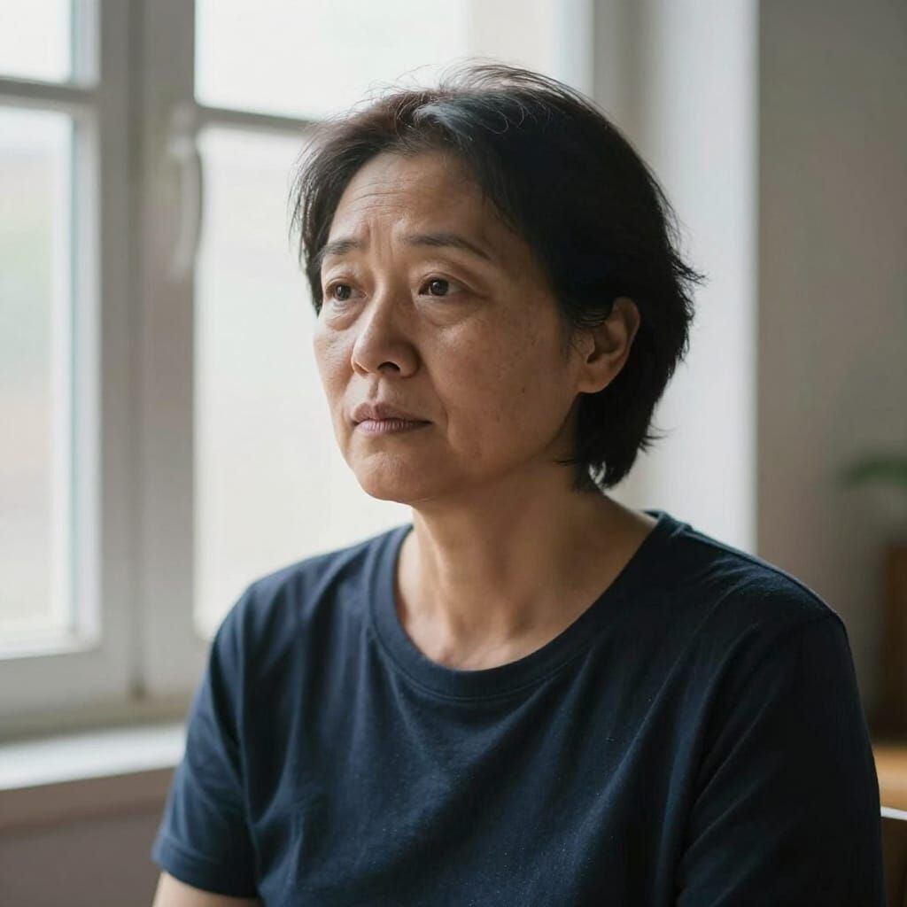 This image showcases an ultra-realistic portrait of a woman bathed in natural window light. Captured candidly with a shallow depth of field, it emphasizes authentic emotion in an editorial photography style.