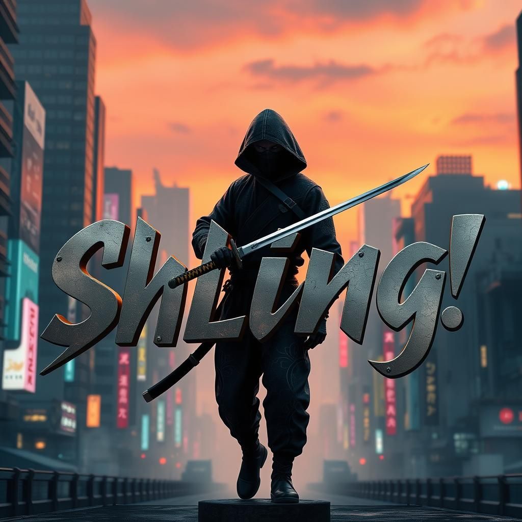 This image shows the word 'Shling!' cut in half mid-air by a katana wielding ninja. The scene is set in a neon-lit cityscape with an anime aesthetic.