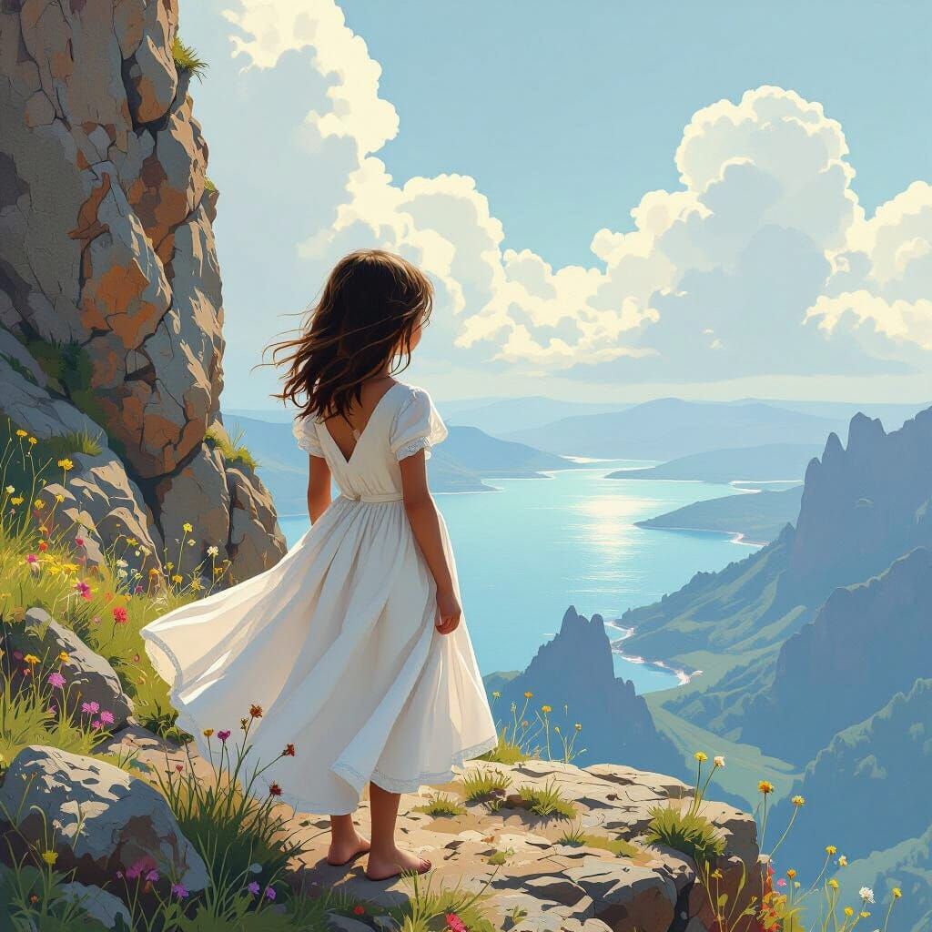 A striking picture of a girl in a white dress overlooking a landscape from a rocky cliff. The artwork has intricate textures and vibrant colors, in a whimsical and dreamy style.