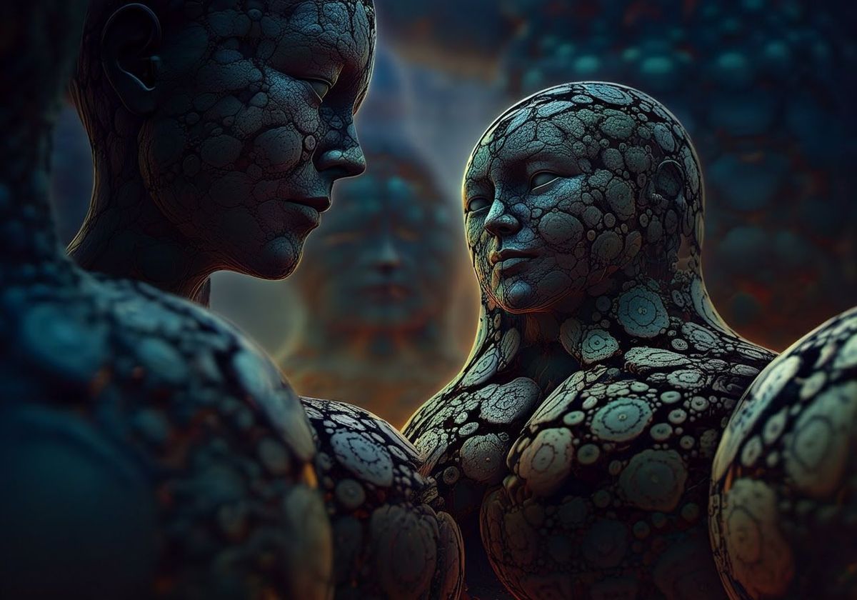 cutaway view giant cyber matryoshkas revealing inner workings of neuromorphing inter-harmonics dimetric view detail so fine it appears infinite reflections symbolising introspection and dreams about another entity backed by exoembodiment swirling nebulous fog that refracts and absorbs the surrounding ...