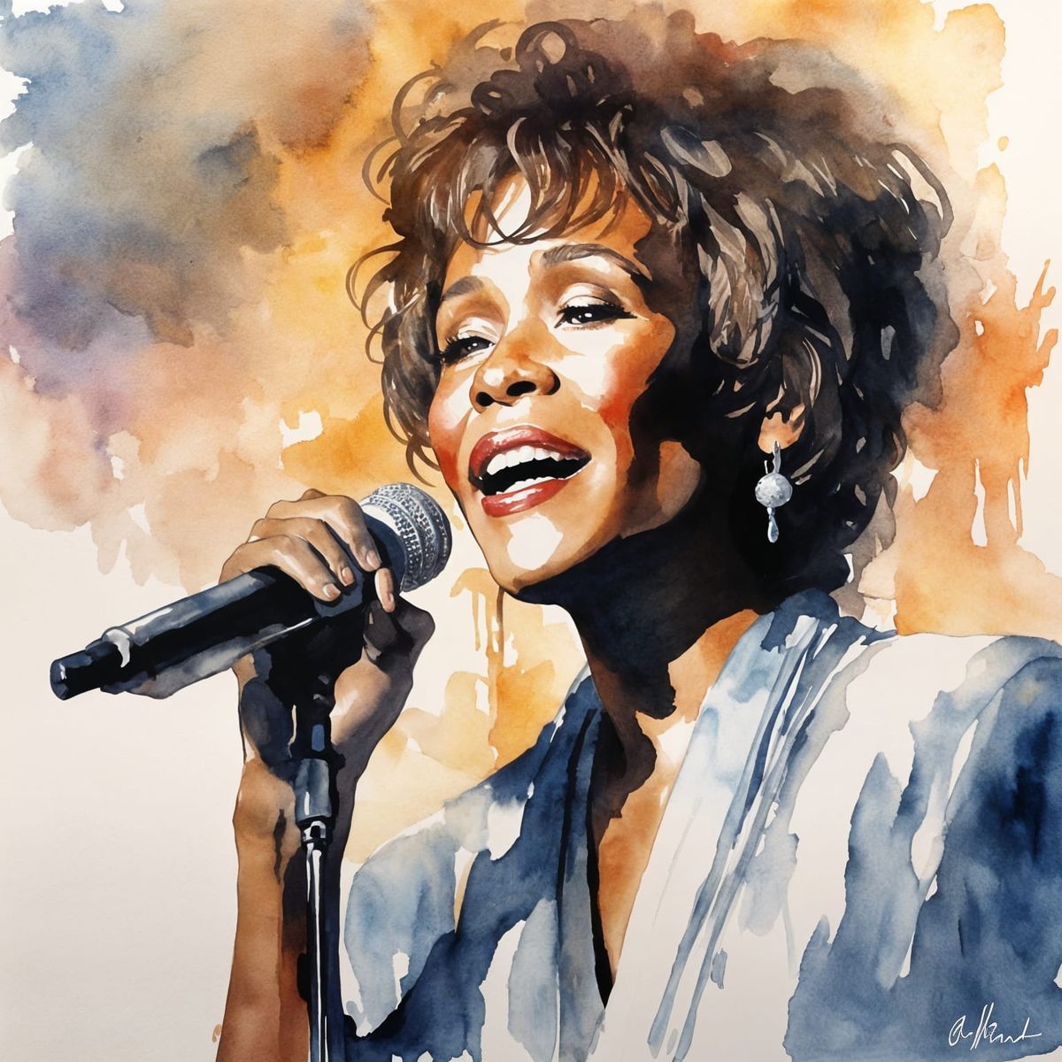 This image shows a soft watercolor portrait of Whitney Houston. The artwork captures her essence with delicate brushstrokes and a gentle color palette, creating a serene and artistic representation.
