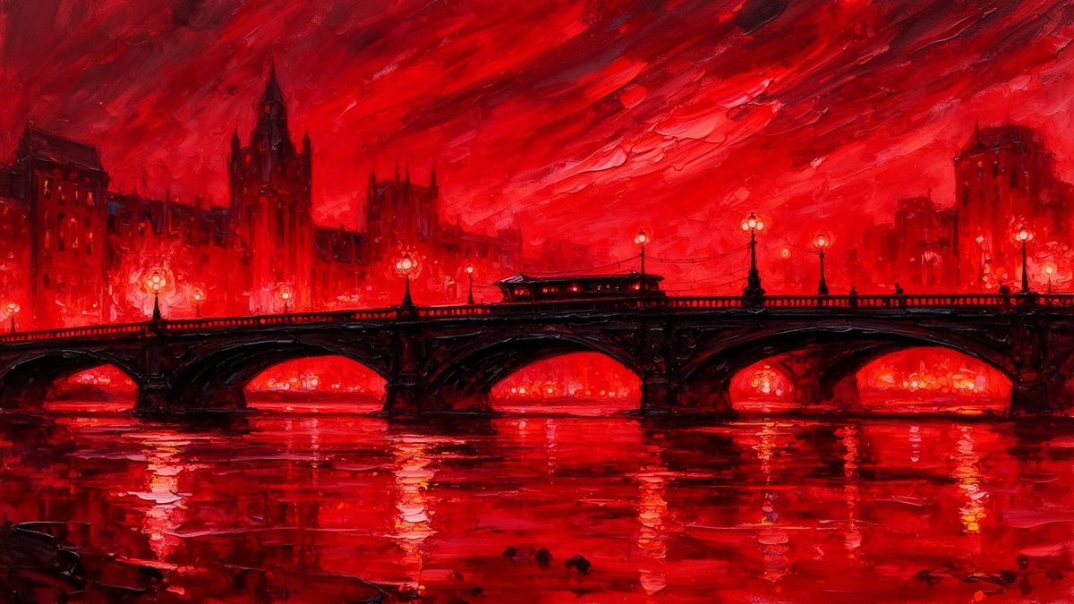 This image shows a bridge over a river with a blurred city in the background. It features intense red colors, thick outlines, and a gouache painting style with textured brush strokes.