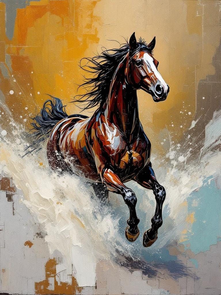 A vivid painting of a horse running. The artist employs bold impasto techniques, building up layers of paint to create a palpable sense of movement and energy, reminiscent of early 20th-century expressionism.