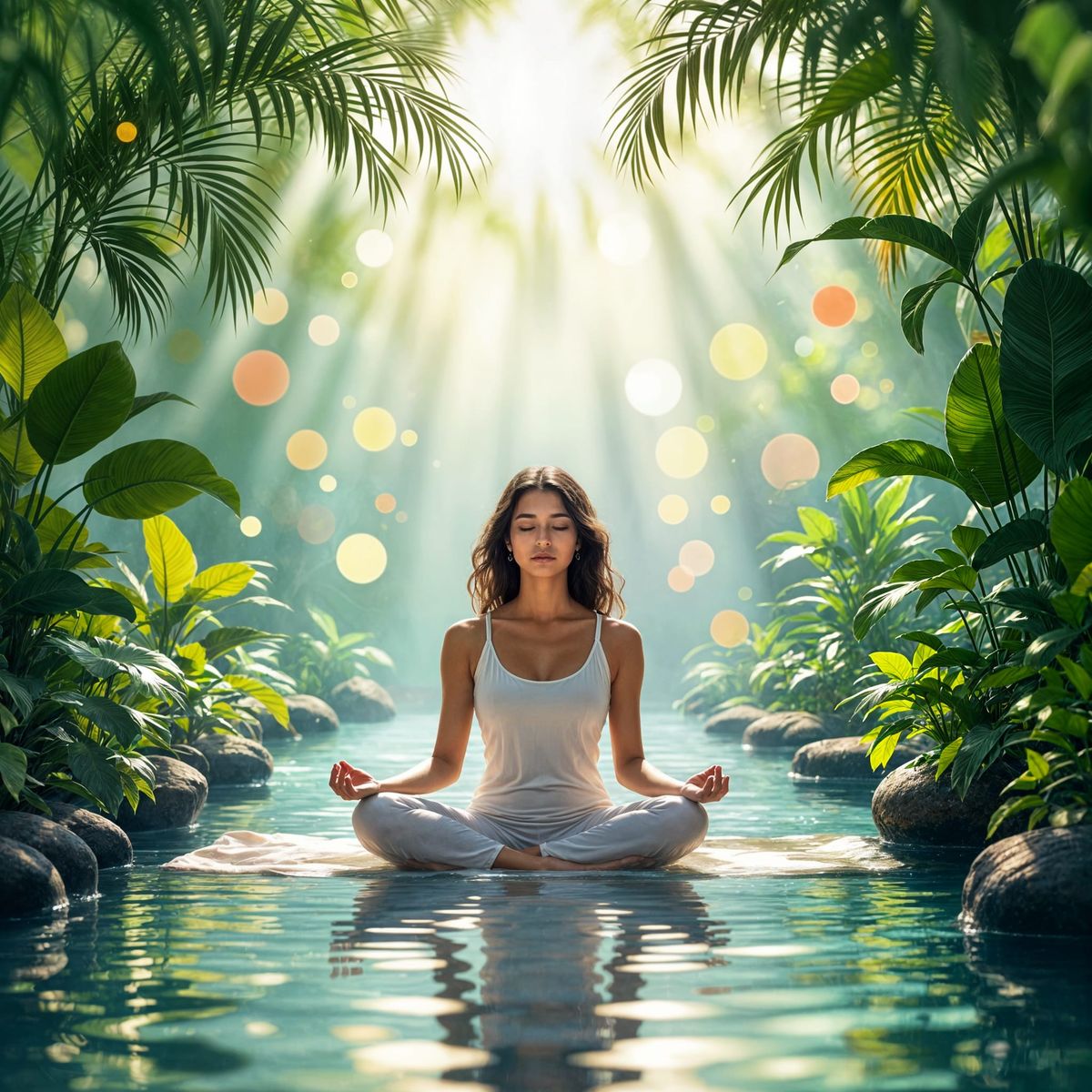 This image shows a woman meditating peacefully in a serene, sun-drenched sanctuary with lush plants and flowing water. Cinematic lighting and hyperrealistic details create a tranquil atmosphere of inner peace and balance.