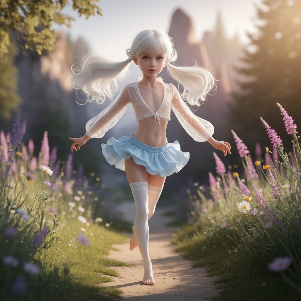This image shows a blonde girl running through a flower-filled meadow. She's wearing a blue skirt, white stockings and a transparent blouse, with sunlight creating a magical atmosphere in this photo.