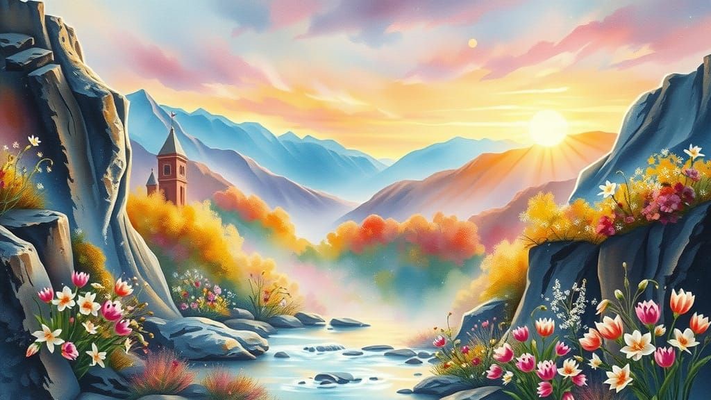 Easily generate your own beautiful spring landscape images with our free AI image generator, featuring soft splatters and metallic effects