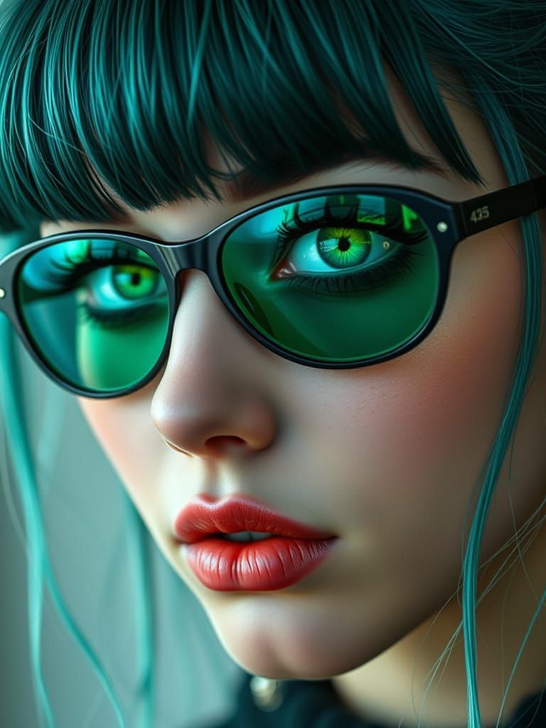 A hyperrealistic close-up portrait of a gothic woman. She has teal hair and green eyes, enhanced with matching eyeshadow and dark eyeliner. The image exhibits futuristic and cinematic qualities.