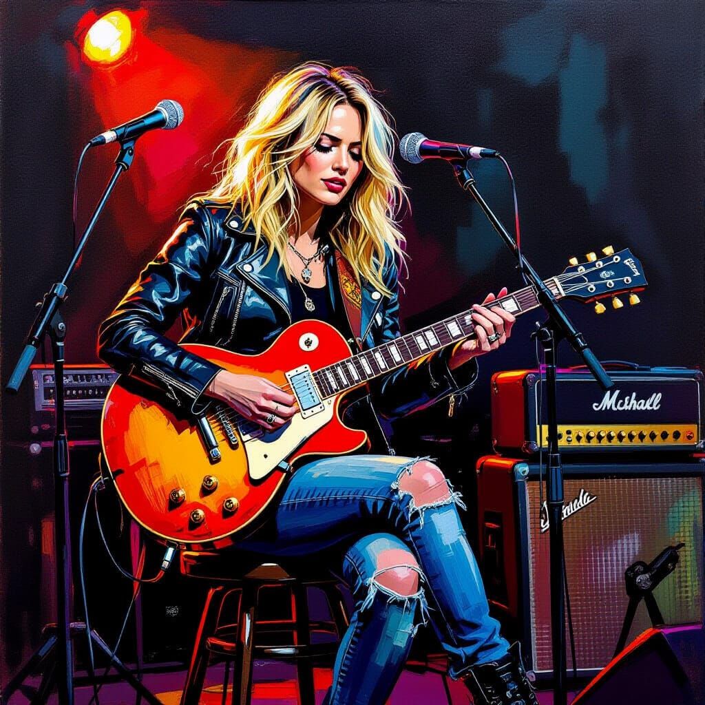 A dynamic image of a woman playing guitar on a dimly lit stage, featuring bold brushstrokes and vibrant colors, capturing a raw, energetic performance.