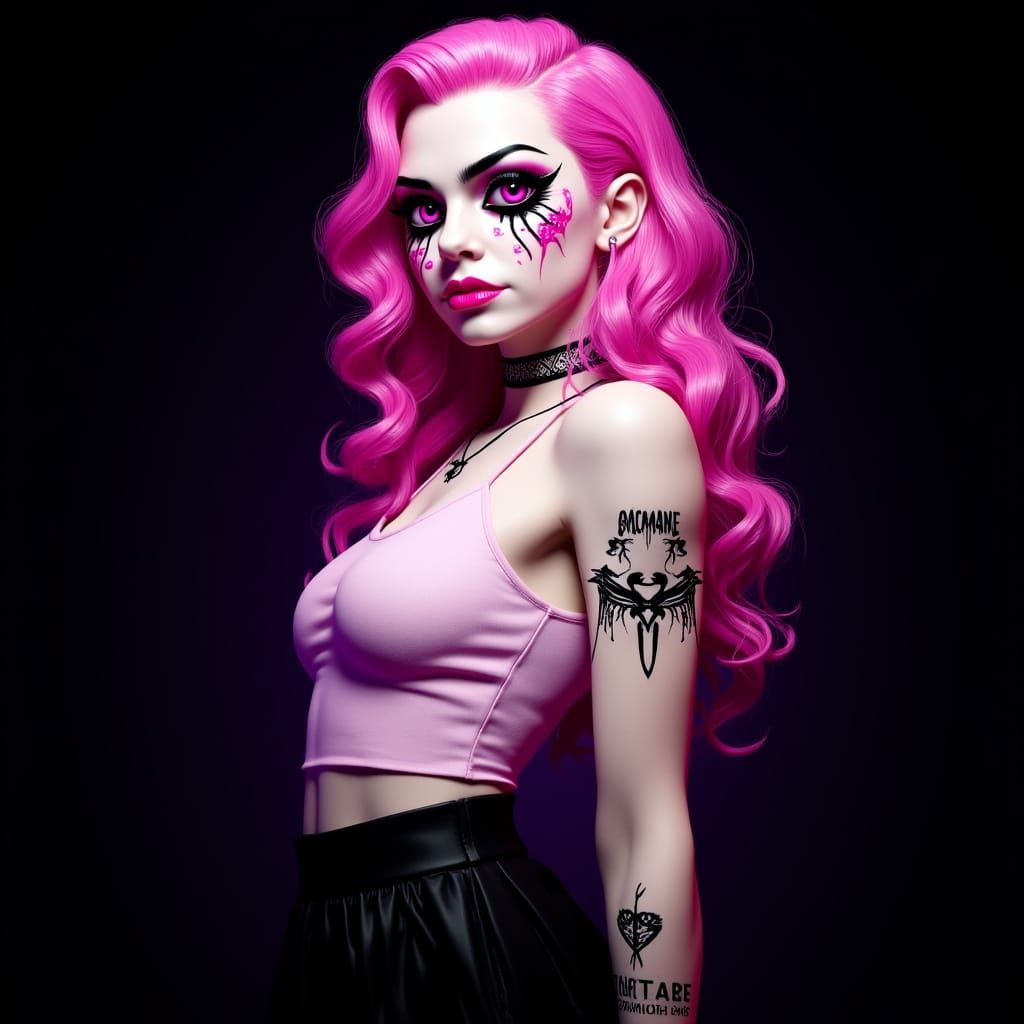 Semi-side view of a young demonic lady, three-quarter angle, high detail overdone goth makeup in pink and black tones, dramatic black eyeliner and eyeshadow blended with vivid neon pink accents, striking neon pink eyes with intricate high-detail irises, ice cream pink wavy hair with pink linin, framing ...
