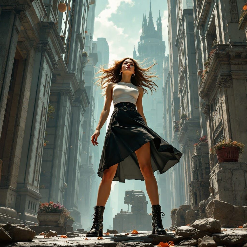 This image shows a modern pin-up woman floating in a cityscape, surrounded by architectural elements defying gravity. The style combines elements of Piranesi and zero-g dynamics, creating a futuristic and liberating atmosphere.