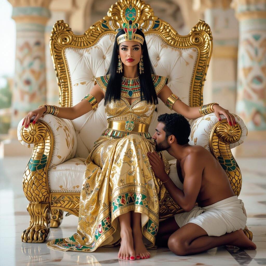 This image shows an Egyptian queen on her throne as a peasant kisses her feet. The photograph uses soft lighting, bokeh and professional photography techniques to capture exquisite detail.