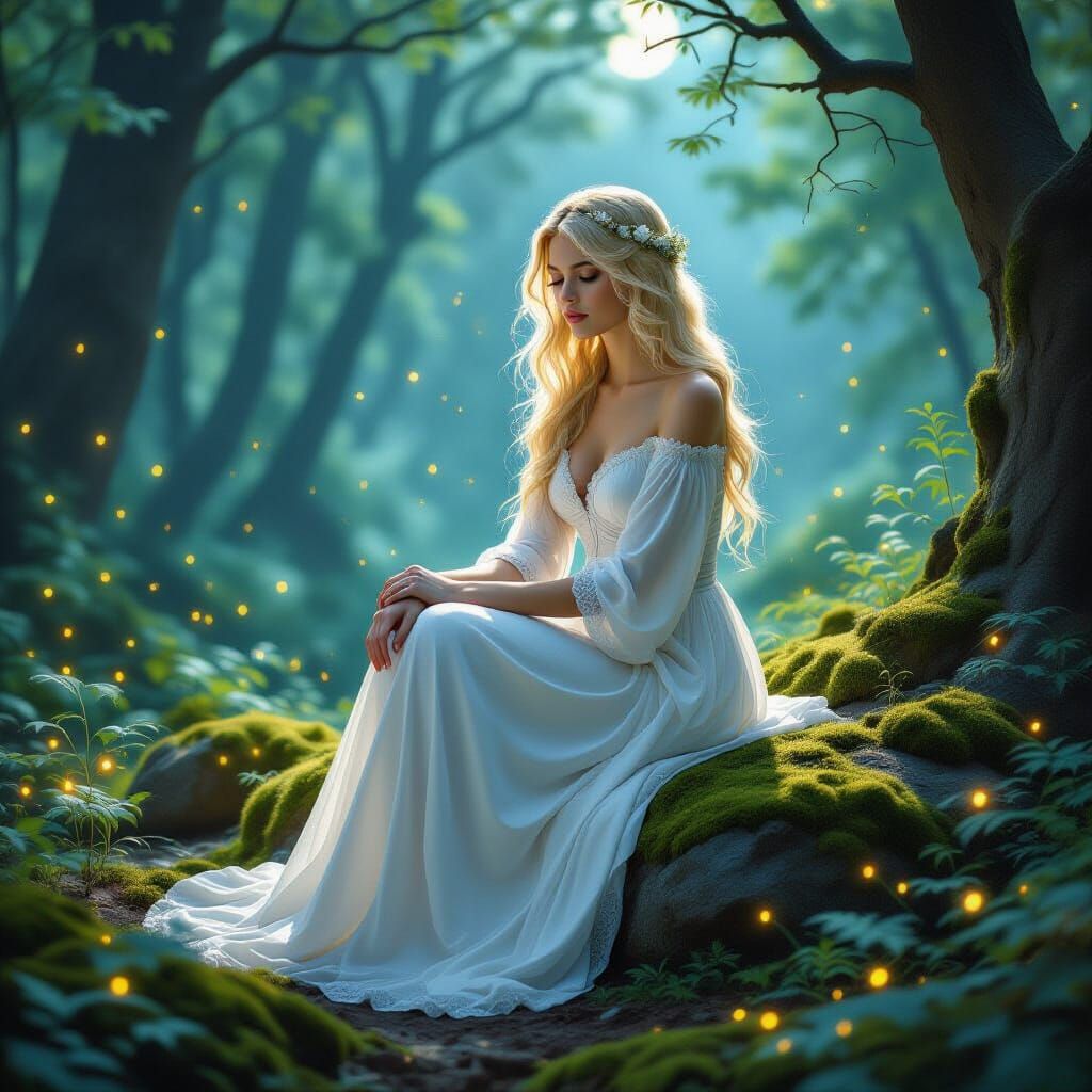 This image shows a blonde woman in a white dress seated on a rock in a magical forest. The scene is illuminated by moonlight and fireflies, rendered with Pre-Raphaelite detail.