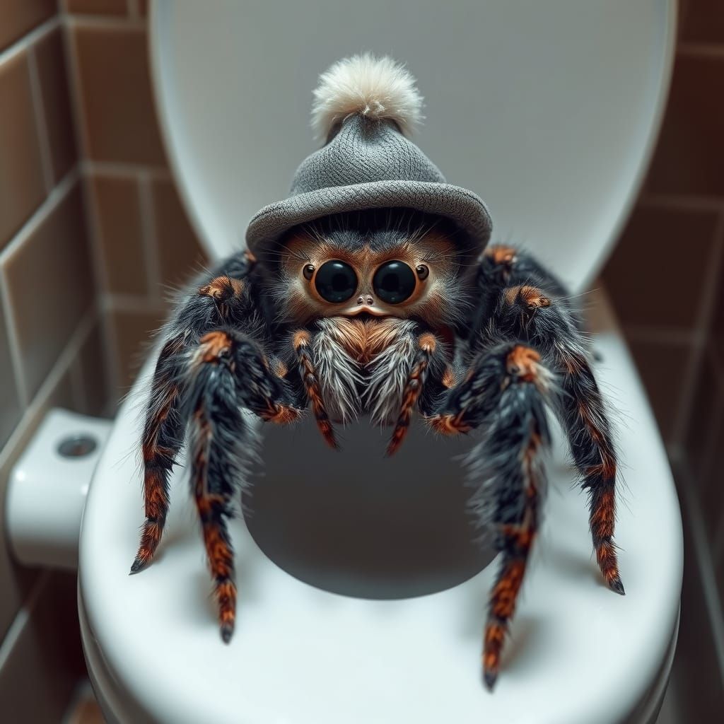 This image shows a large, fluffy spider sitting on a white toilet, surrounded by bathroom tiles, with precise textures and shading in a highly realistic style.