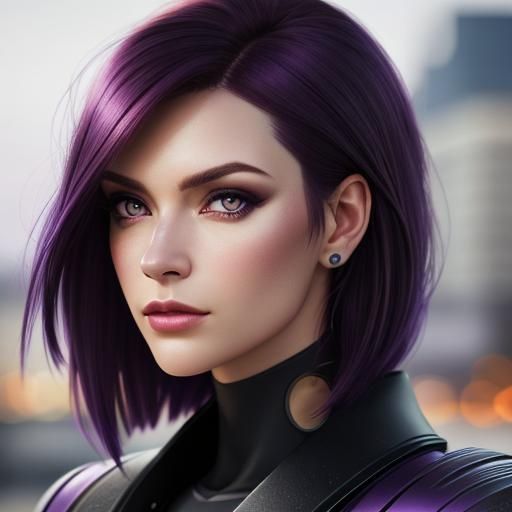 This image shows a photorealistic portrait of a beautiful young brunette woman with purple hair and soft violet eyes, set against an industrial backdrop. The image has a professional photography aesthetic.