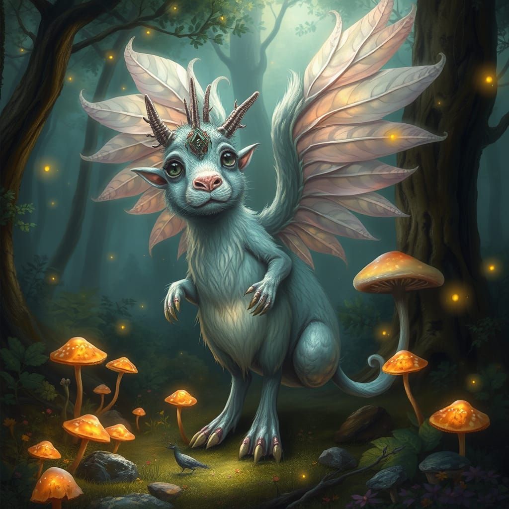 This image shows a mystical, otherworldly creature standing in a lush forest, surrounded by glowing mushrooms and fireflies, with shimmering, ethereal feathers and intricate, symbolic details reminiscent of fantasy art and surreal landscapes.