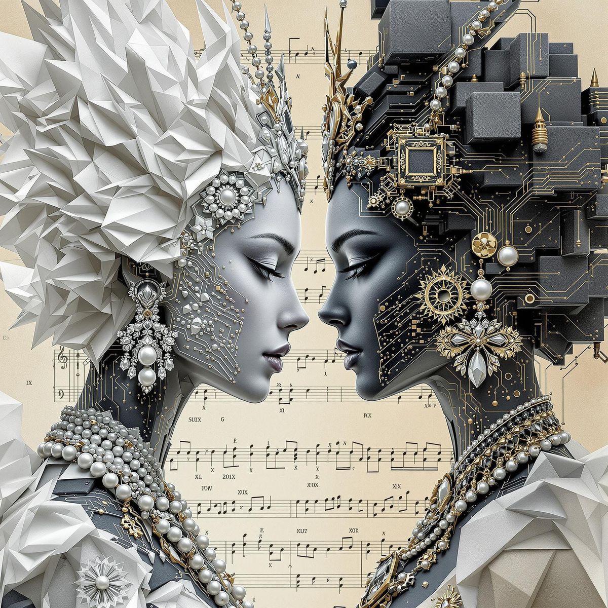 This image shows two warrior princesses facing each other, crafted from origami and stone respectively. The background blends musical notes and circuitry in a surreal style, with fine line art.