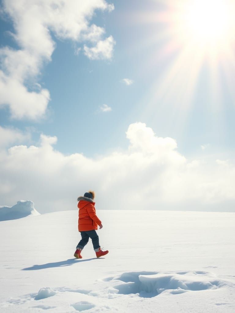This image shows a lone girl in winter clothing walking in Antarctica, bathed in ethereal light. Soft focus and bright, divine sunlight create a serene and otherworldly atmosphere.