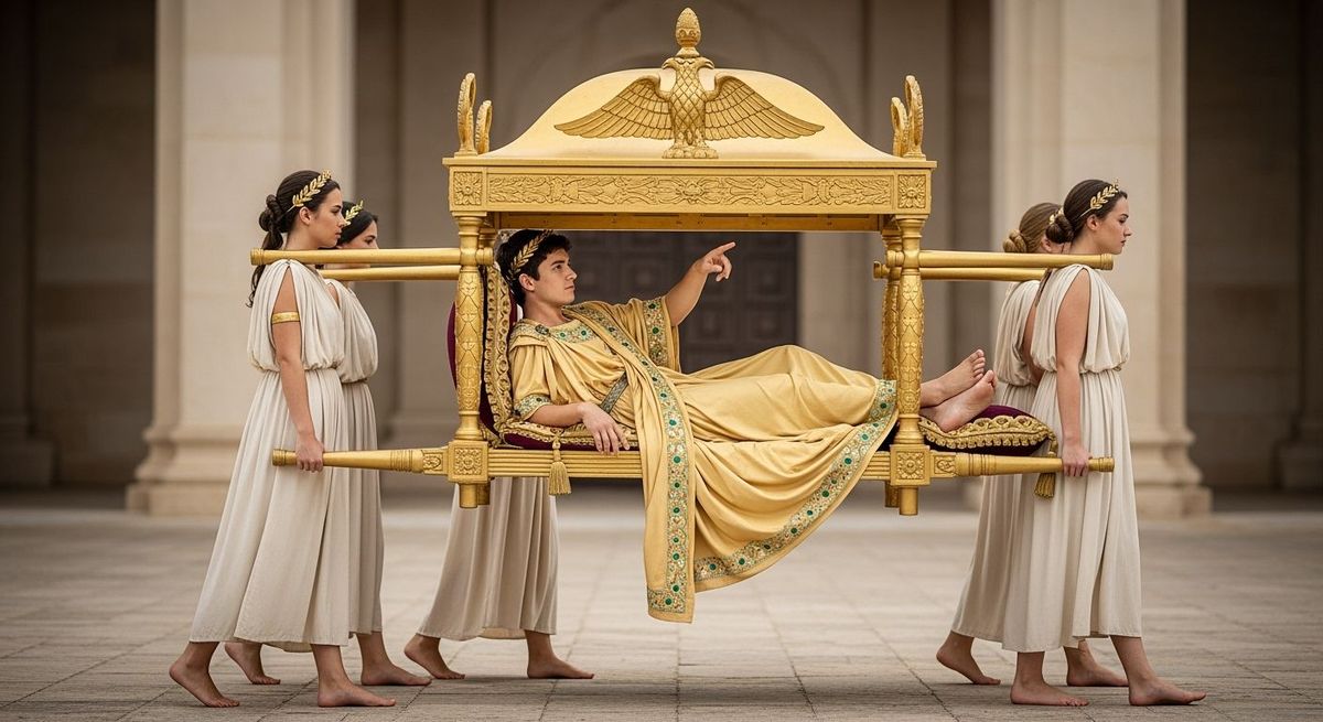 This image shows a Roman Emperor reclining on a golden sedan chair carried by servants. He wears a gold toga with emeralds and gestures forward. The image has a professional photography style with a bokeh effect.