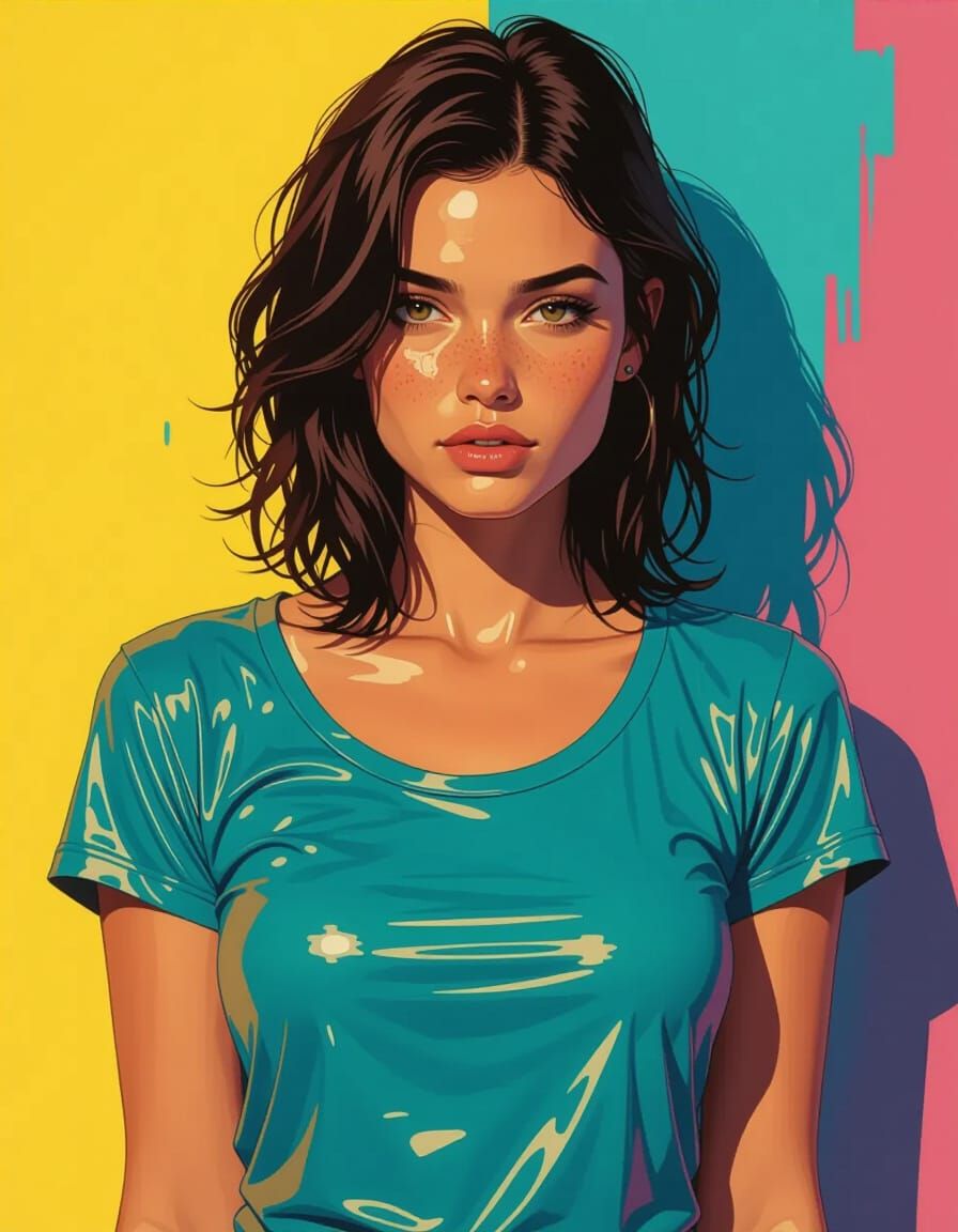 A hyperrealistic image of a woman in a clinging, wet t-shirt. The portrait, emphasizing dramatic light and shadow, is set against a vibrant backdrop, rendered as digital art.