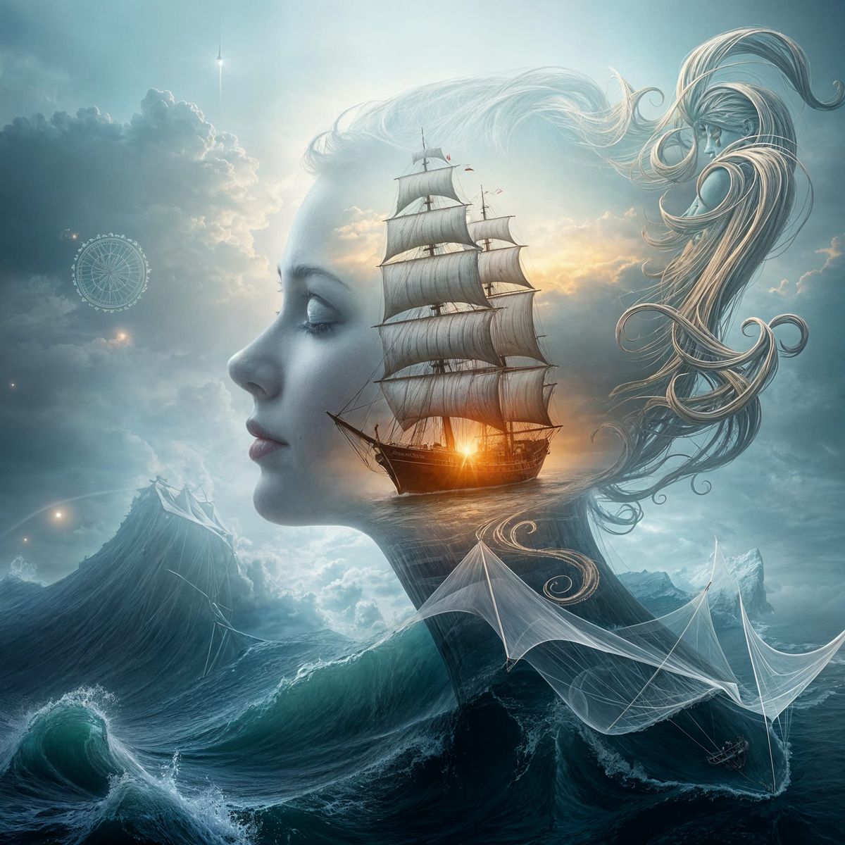 This image features a mesmerizing double exposure, blending a transparent female silhouette with a dramatic sailing ship caught in a storm. Evokes fantasy and mystique.