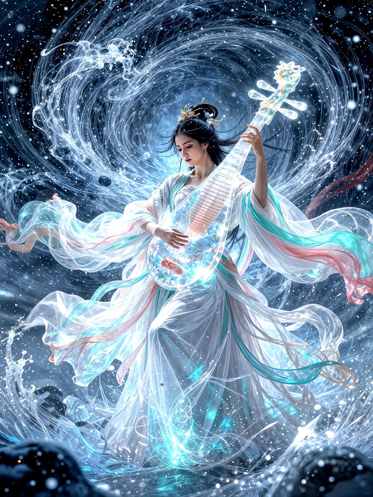 This image depicts a XianXia maiden playing a glowing crystalline pipa, releasing powerful waves of light and sound. Qi elements and stormy spirals create incandescent shockwaves and vortexes of glowing frost, with her hair and robes billowing in the elemental force.