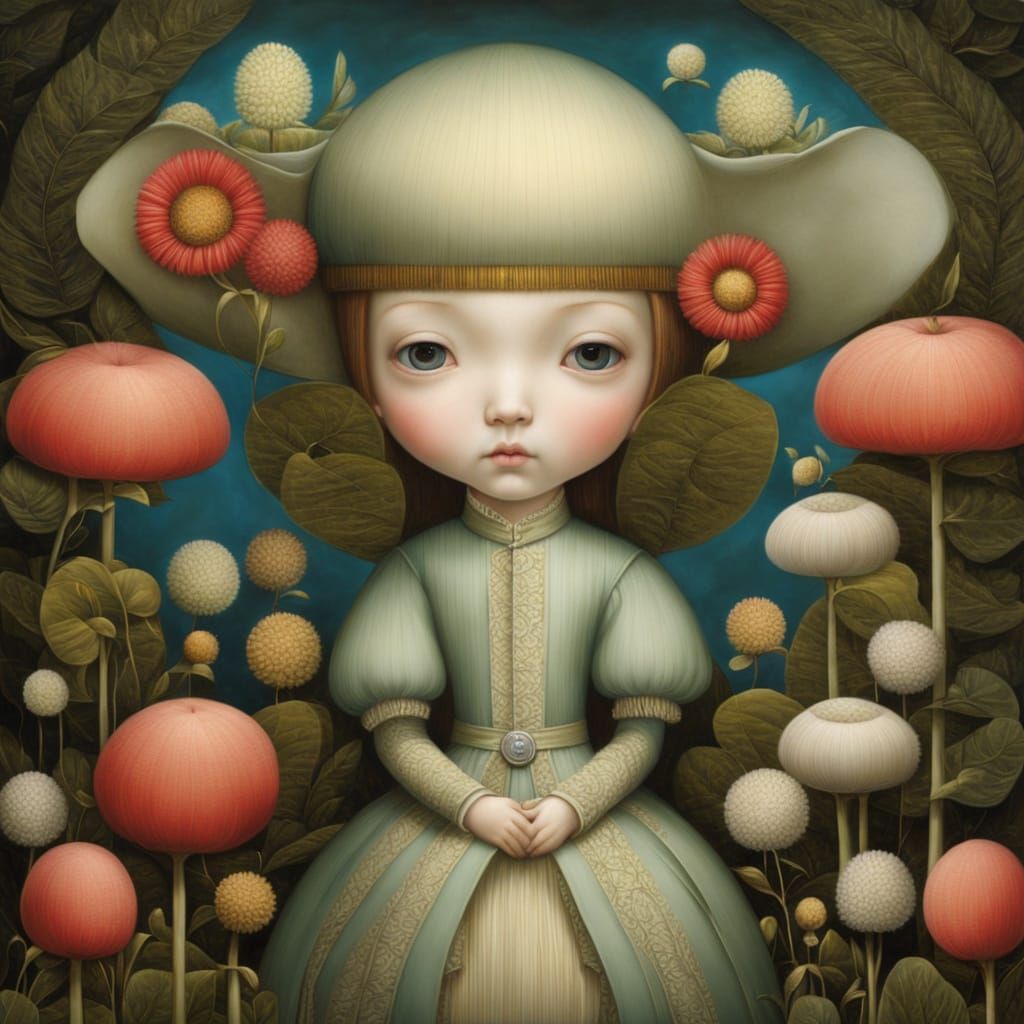 This image features characters inspired by the surreal and whimsical artistic styles of Nicoletta Ceccoli and Naoto Hattori, blending their unique visual elements.