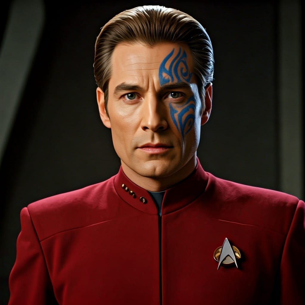 A digital portrait of Chakotay from Star Trek: Voyager. The character wears a red uniform and has distinct blue tribal tattoos on one side of his face.