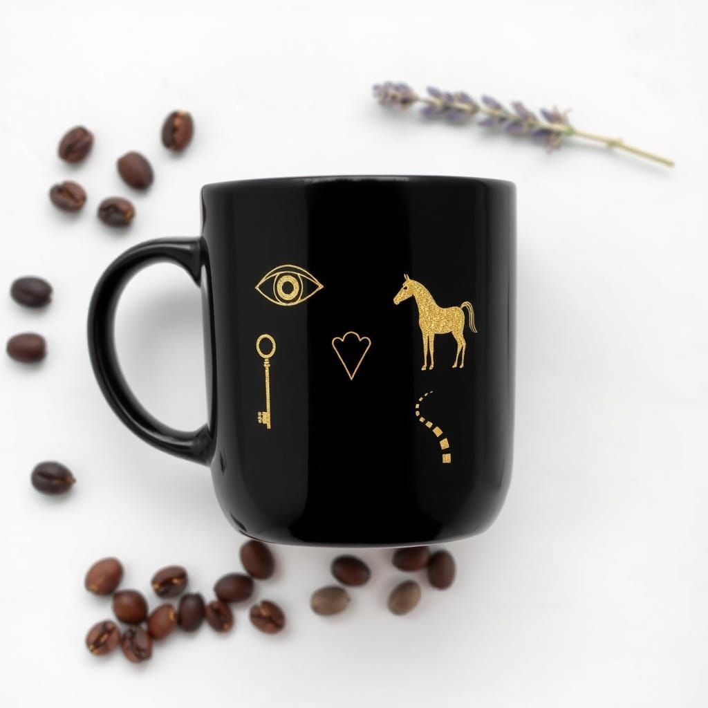 This image features a minimalist design on a black ceramic mug, adorned with delicate gold ink illustrations of coffee fortune symbols, surrounded by coffee beans and dried lavender in a flat lay composition, evoking Scandinavian design simplicity.