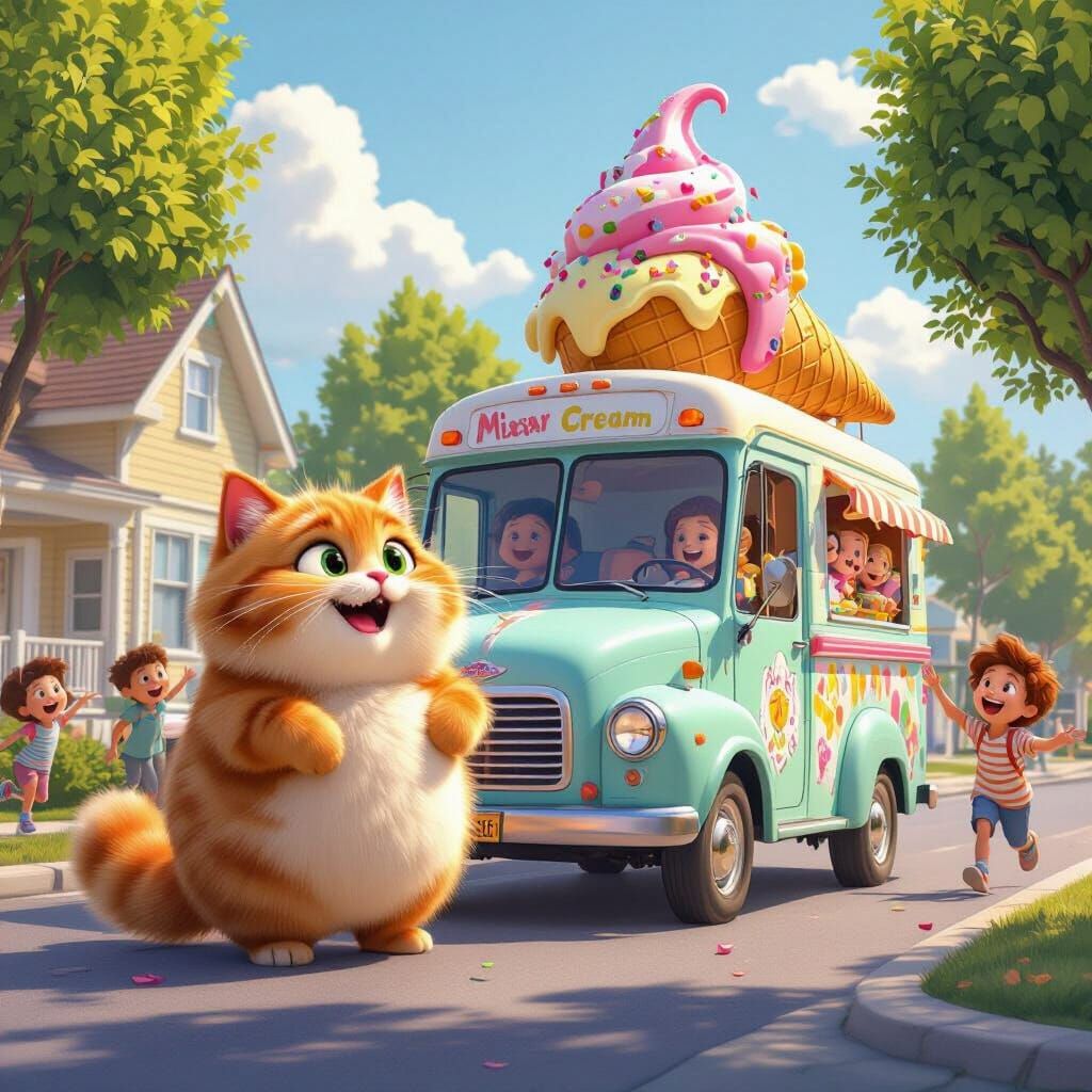 This image shows a fluffy orange cat watching an ice cream truck arrive. The 3D rendering features a Disney Pixar style with bright colors, bold lines, and joyful children, creating a fantastical scene.