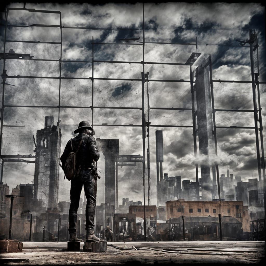 A concept art piece depicting a large iron sculpture in a desolate urban environment. It features rusty rebar, ruined cars, and a dust cloud, rendered in a low-poly, brutalist style with dramatic lighting.