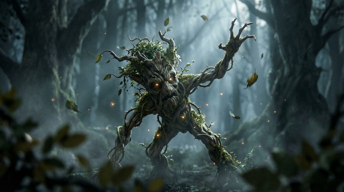 This ultra-cinematic, photorealistic image captures a terrifying Awakened Shrub lurking in a misty, enchanted forest. Shot with anamorphic lenses and film grain, it features hyper-detailed textures and glowing eyes.