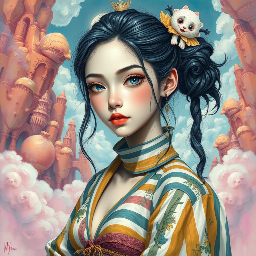 This image shows a young woman with a porcelain complexion and delicate features, wearing a striped outfit with intricate textures and subtle grunge undertones, set against a surreal backdrop, in a semi-realistic style with visible brushstrokes, blending traditional and digital art techniques, with a hin...