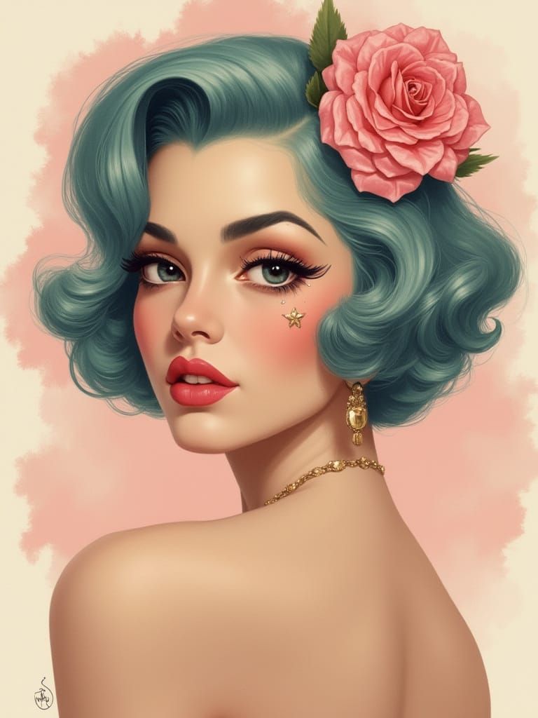 This image shows a beautiful woman in vintage pin-up style with short teal hair and pink roses. She has elegant makeup and a confident expression, set against a soft watercolor background.