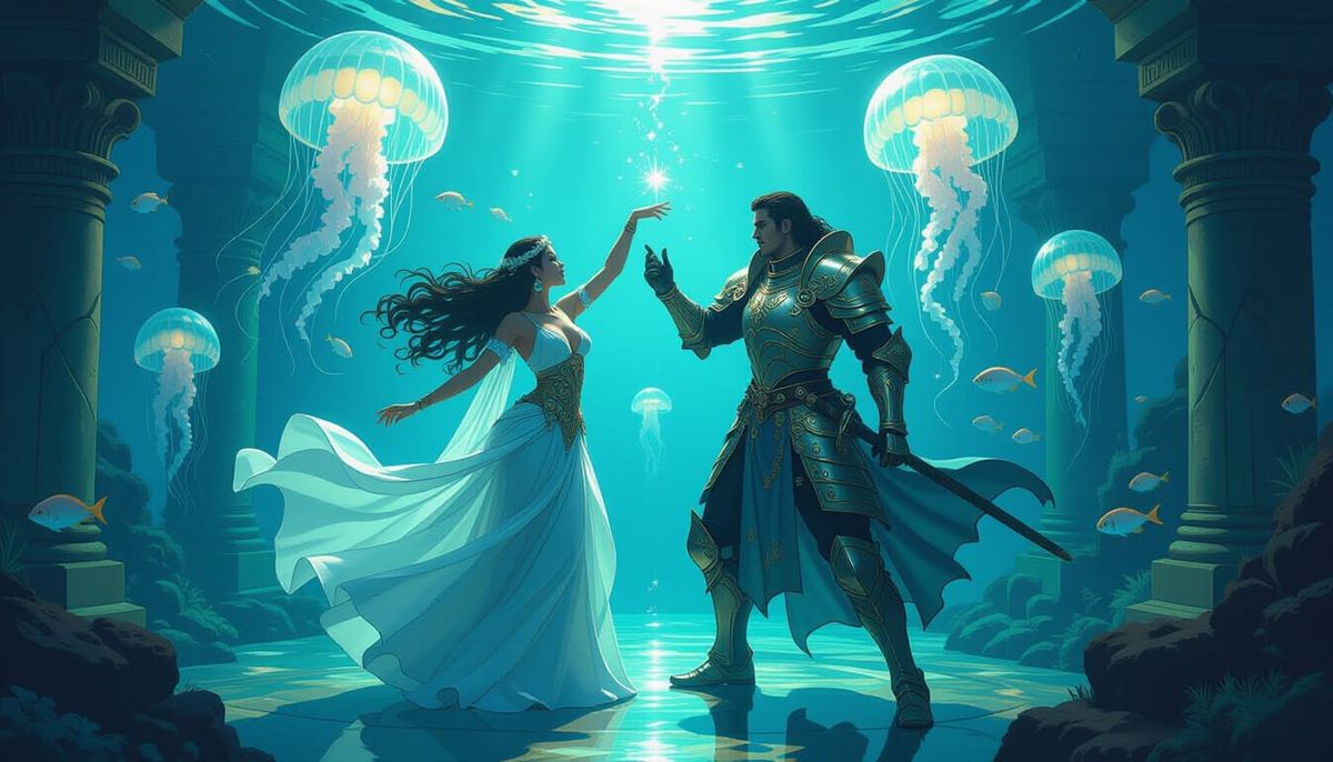 This image shows a female dancer and a warrior knight dancing in an underwater temple. Luminous jellyfish light the scene, while a school of fish watches. The artwork is a hyperdetailed matte painting with rich colors.
