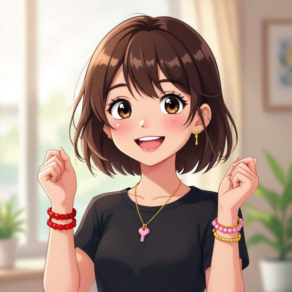 This image features a smiling 12-year-old girl with brown hair and eyes, wearing a black shirt and layered jewelry. Rendered in a bright anime style with soft, warm lighting.