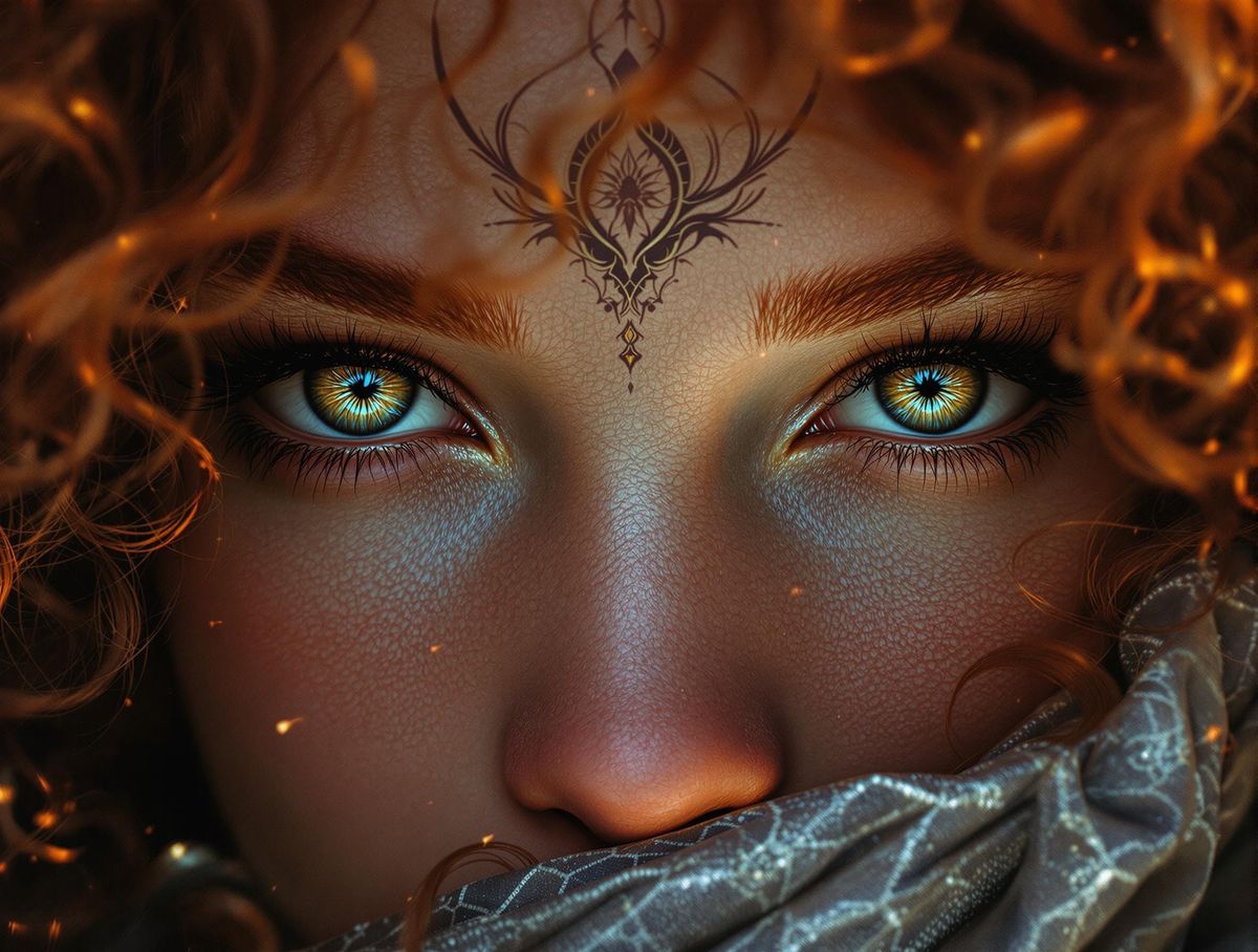 This stunning digital painting depicts a majestic red-headed goddess with intricately designed eyes and a richly detailed background, set against a backdrop of dramatic lighting and cinematic grandeur.