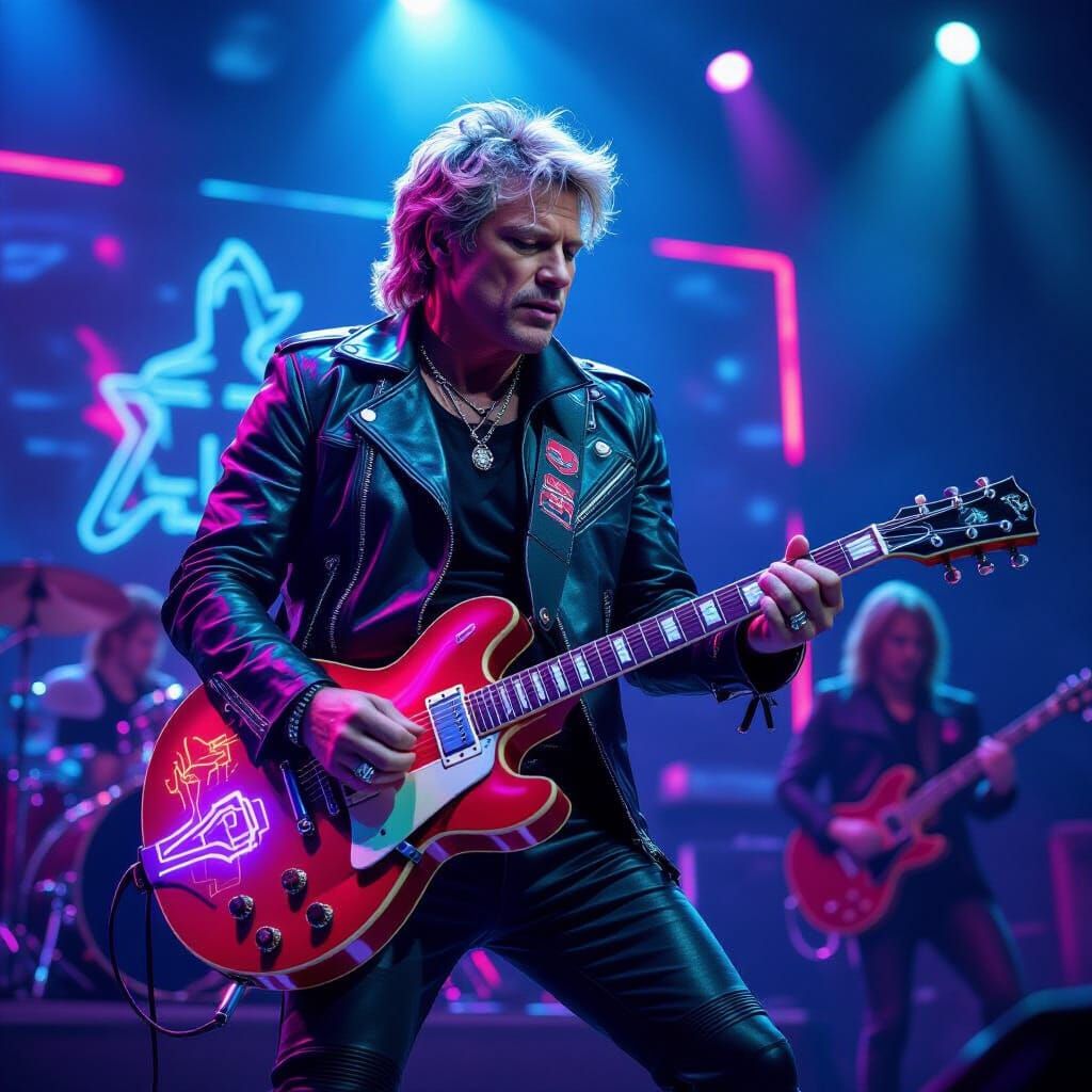 Imagine Jon Bon Jovi, age 30, as a cyberpunk rockstar, performing on a stage filled with neon lights and holographic displays.