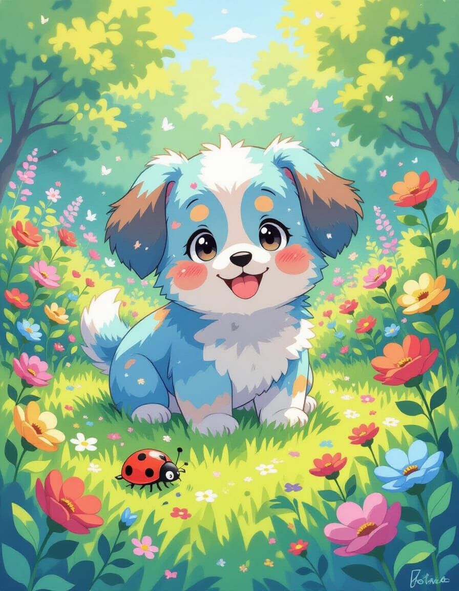 A vibrant image showing a tiny ladybug in a garden with a playful, gigantic blue puppy. The artwork is rendered in a whimsical anime style with watercolor effects and pastel colors.