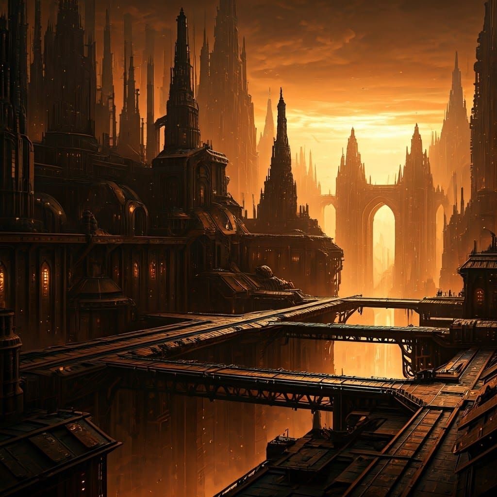 A dramatic digital painting of a vast, interconnected hive city. Gothic skyscrapers mix with industrial facilities under an orange, smog-filled sky, reminiscent of dark, maximalist digital matte paintings.