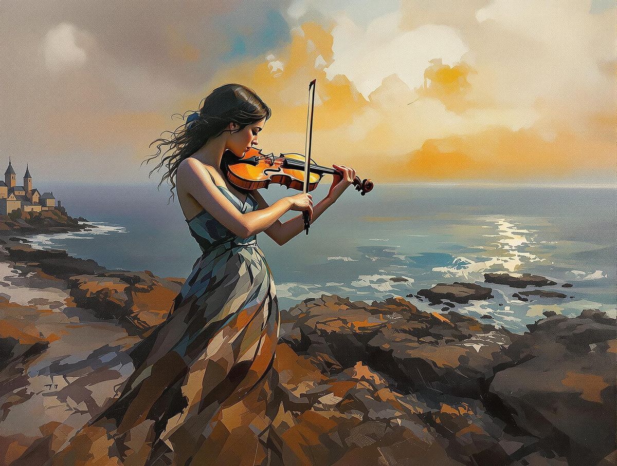 A charcoal drawing of a woman playing a violin near a village shoreline. The artwork features chiaroscuro, luminism, contrasting colors, and impasto textures reminiscent of an oil painting.
