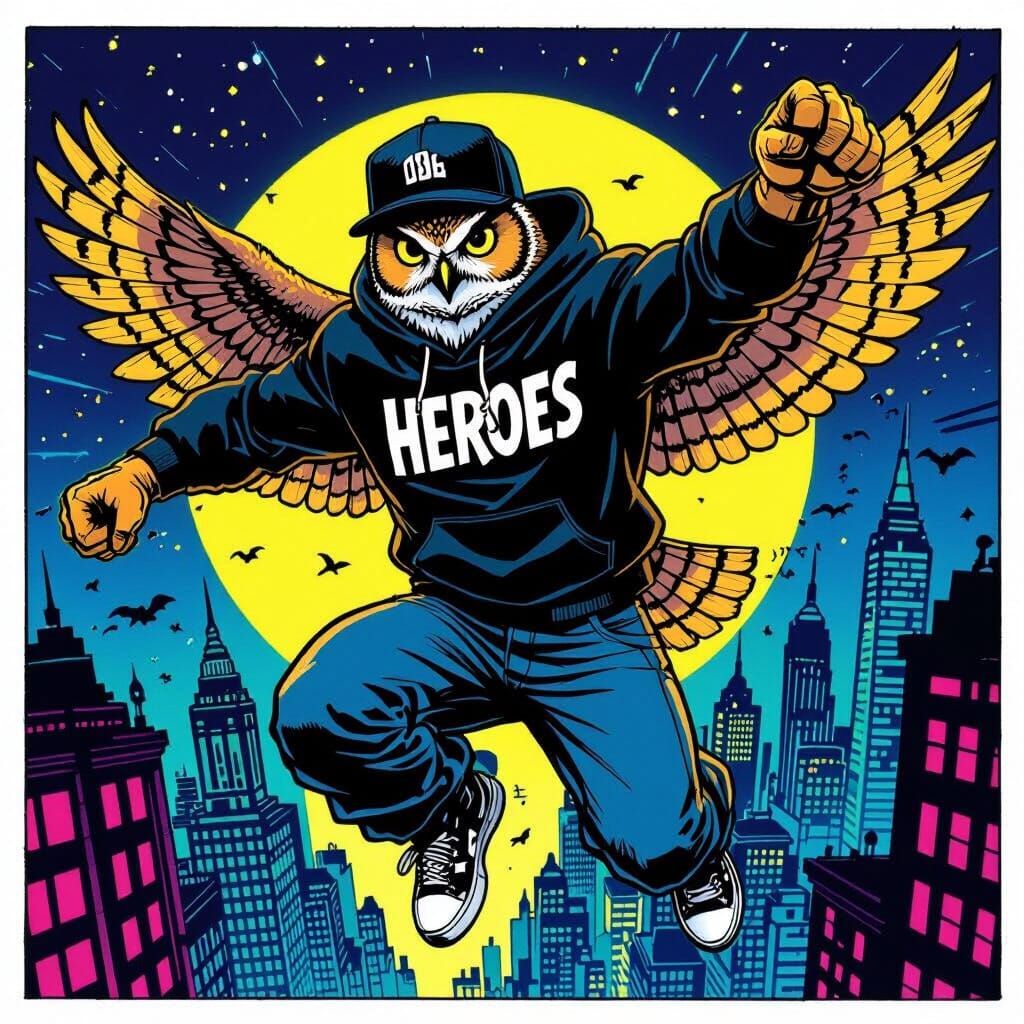 This image shows a spotted owl superhero in a dynamic comic book style, wearing hip hop attire and a hoodie with 'HEROES' on it, flying over a neon city.