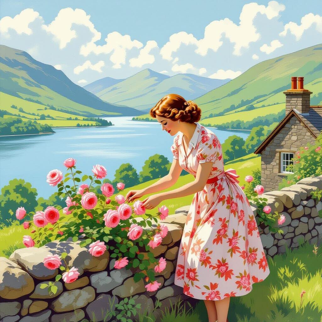 A serene image of a woman gardening in the Scottish Highlands. Soft light illuminates pink roses climbing a cottage, with rolling hills in the background, reminiscent of vintage storybook illustration.
