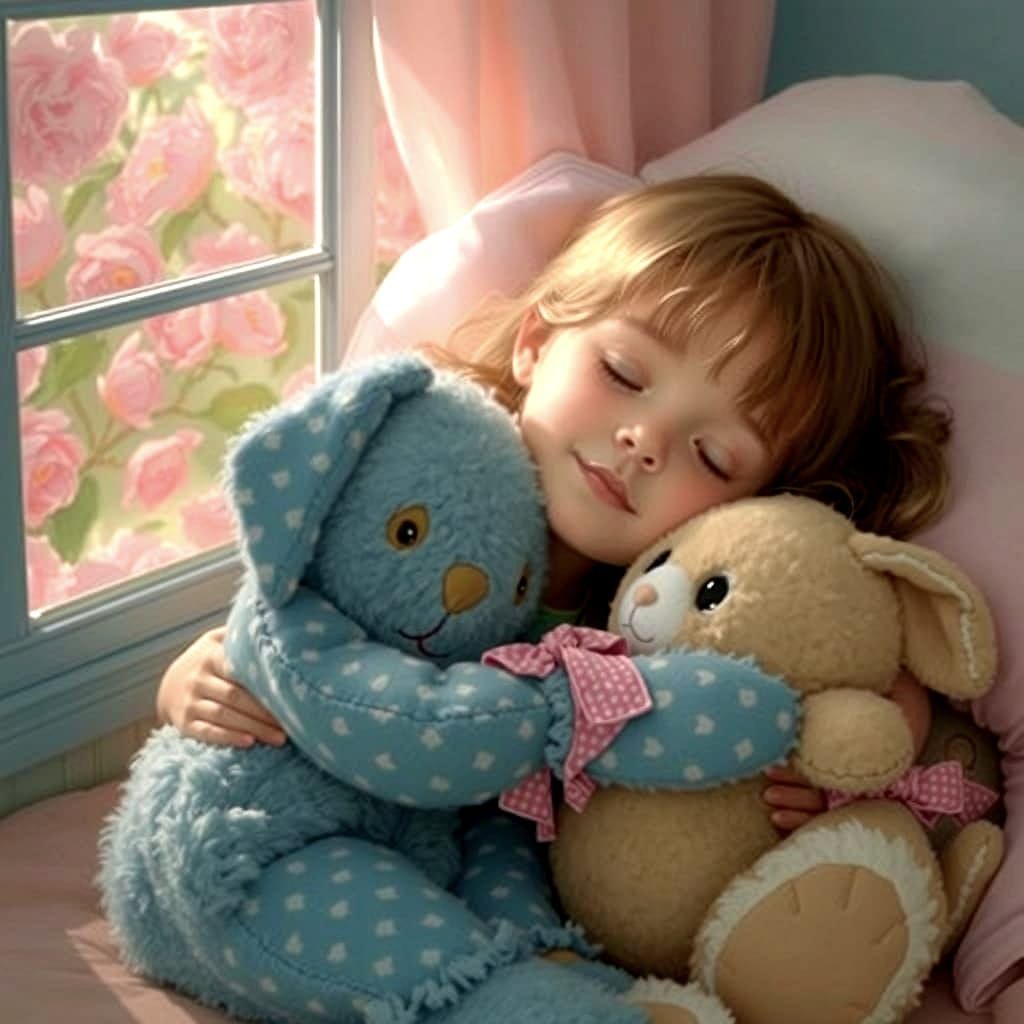 A heartwarming scene of a plush rabbit resting in a child's bed, surrounded by soft blankets and quiet darkness.