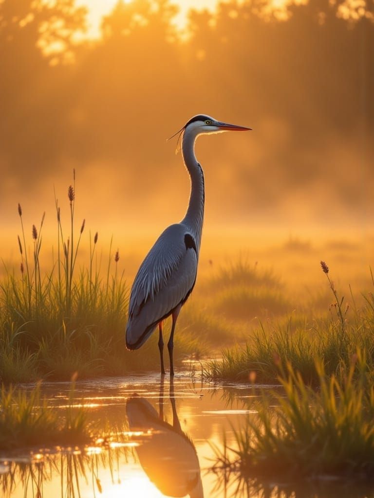 A majestic great blue heron stands still in a misty wetland at sunrise, surrounded by tall reeds and silhouetted trees, with golden light reflecting on calm water, showcasing the quiet beauty of nature in the wild.